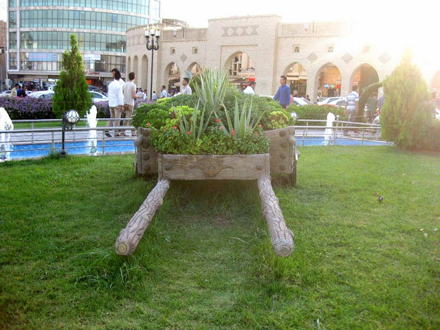 كارێك كه عهرهبانهیهكه له باخچهی نافورهی شاری ههولێر